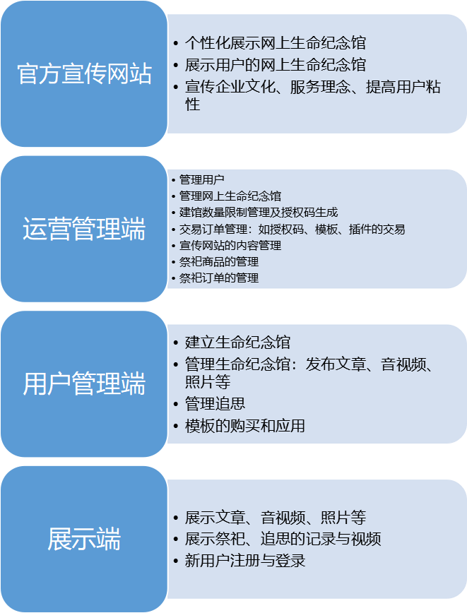 單一的服務(wù)已經(jīng)無法滿足多樣化的用戶需求?!八劳霾⒉皇侨松慕K點,遺忘才是”,所以緬懷紀(jì)念先人是用戶的迫切需求。傳統(tǒng)的祭祀方式不容易延續(xù)先人的精神傳承。但是,互聯(lián)網(wǎng)可以。我們研發(fā)了網(wǎng)上生命紀(jì)念館系統(tǒng),可以將先人的故事,照片,音視頻通過多樣的風(fēng)格呈現(xiàn)出來,讓后人鏤骨銘心,讓先人世代留名。